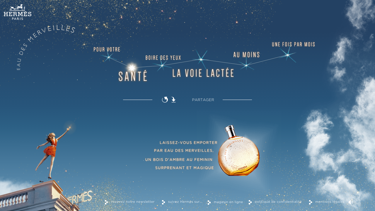 For its 2015 Eau Des Merveilles campaign, Hermes wanted a fully animated website to invite internet users to enter into the land of words and wonders. The website diplays 3D animatiions thanks to the THREEjs library. The user is immersed in a galaxy of words that merge into wonderful sentences when clicking on them. The adventures goes on on social media and collaborating points of sale.